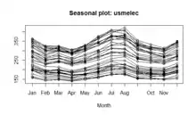 A seasonality plot of US electricity usage - A seasonal plot will show the data from each season overlapped[4]
