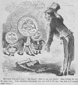 Numismatist and coin dealer Q. David Bowers believes that most Seated Liberty dollars produced after 1853 were shipped to China to pay for luxury goods, including tea and silk.[36] R. W. Julian argued to the contrary, that continued production of the dollar had little to do with trade with the Orient (where goods were paid for in silver), suggesting instead that the coins were sent to the West for use there.[36] However, although the Mint's Engraving Department sent dies for the dollar to the San Francisco facility repeatedly from 1858 on, the California mint used them only once before 1870, striking 20,000 dollars in 1859, a year in which 255,700 were struck at Philadelphia and 360,000 at New Orleans. Production at New Orleans was disrupted after 1860 by the Civil War; it did not strike silver dollars again until 1879, after the end of the Seated Liberty series.[24][37][38] After the outbreak of the war in 1861, inflationary greenbacks were introduced, and precious-metal coins vanished from circulation.[39][40] In April 1863, new Mint Director James Pollock argued that the silver dollar be eliminated, noting in a letter that the coin "no longer enters into our monetary system. The few pieces made are for Asiatic and other foreign trade and are not seen in circulation."[39]