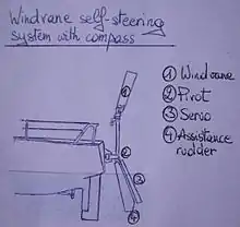 Mechanical self-steering units are made by a number of manufacturers,[4] but most systems produced today share the same principle (servo pendulum rudder, see below). As well as their requirement for electric power, many long-distance cruisers observe that electronic self-steering machinery is complex and unlikely to be repairable without spare parts in remote areas. By contrast the vane gear offers at least the possibility of an improvised repair at sea, and can usually be rebuilt on land using non-specific parts (sometimes plumbing parts) by a local welder or machinist. To minimize the speed loss by the self steering gear it is essential to have the vessel's sails balanced with little load on the rudder before any attempt is made to engage the self steering. With the sails are trimmed correctly, the force-balance of the servo oar and the main or auxiliary rudder is minimized that way, that the lowest angles of attack of rudder and servo oar towards the water flow are achieved. Some experimentation and judgement is usually needed, however, to determine the proper settings for a given vessel and steering mechanism. A popular source on contemporary windvane technology is The Windvane Self-Steering Handbook.[5] One particularly valuable contribution of Morris's book is his coverage of the variety of alloys used in vane gear manufacturing. Morris admits to his practice of setting a kitchen timer for a half-hour at a time and sleeping while the windvane steering device controls the helm, even in head winds of 25 to 35 knots. In a recent interview, he said he once narrowly missed being hit by a huge freighter while sleeping on his sail up the Red Sea. Morris points out, "An autopilot wouldn't have made any difference in this case. If I had been using an electronic autopilot, that freighter still would have been there. I made a choice to sail two-thirds of my circumnavigation single-handed, and I accepted the risks that came with that decision. I guess fate was on my side."