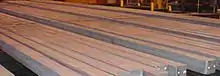 In the era of commercial wrought iron, blooms were slag-riddled iron castings poured in a bloomery before being worked into wrought iron. In the era of commercial steel, blooms are intermediate-stage pieces of steel produced by a first pass of rolling (in a blooming mill) that works the ingots down to a smaller cross-sectional area, but still greater than 36 in2 (230 cm2).[1] Blooms are usually further processed via rotary piercing, structural shape rolling and profile rolling. Common final products include structural shapes, rails, rods, and seamless pipes.[3]
