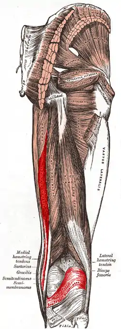 ![]() Muscles of the gluteal and posterior femoral regions (semimembranosus labeled at bottom left) | |