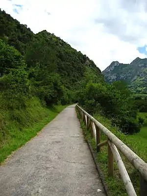 The Senda del Oso (Spanish: Bear's Path) is a 50-kilometre (31 mi)[1] rail-trail, hiking and bicycle path running through Asturias in northern Spain, running approximately between Entragu and Santa Marina in the south to Trubia in the north, near Oviedo. Originally a mining rail line used until 1963, the Senda is now a tourist destination for the area, and was featured in a Rails to Trails article in 2010.[2] The path goes through some of the last remaining brown bear habitat in Spain, and indeed, was partly inspired by a nearby bear conservation project.[3]