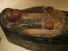 Sennefer was an Ancient Egyptian official with the title Servant in the Place of Truth at the end of the 18th Dynasty. He is mainly known due to his unlooted burial found in 1928 by excavations under Bernard Bruyère at Deir el-Medina.[1] The burial chamber of Sennefer was found within the tomb of the servant at the place of truth Hormes (tomb no. 1159a). The small chamber contained the inscribed coffins of Sennefer[2] and his wife Nefertiti. Both were found wrapped in linen. Sennefer was also adorned with a mummy mask. He had a heart scarab and was adorned with a pectoral.[3] On his coffin was placed a painted piece of cloth, showing Sennefer before an offering table.[4] Furthermore, the burial contained different types of furniture, including a bed, a box, a head rest and several pottery as well as stone vessels. The burial of a child in an undecorated box was found, too.[5] Two shabti figures are datable by style to the end of the 18th Dynasty.[6]