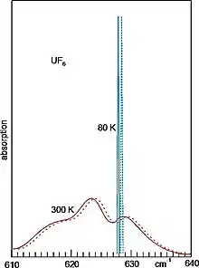 Infrared absorption spectra of the two UF6 isotopes at 300 and 80 K.