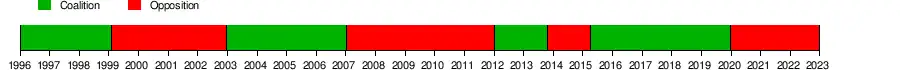 | Year | Leader | Popular vote | % of popular vote | # of seats | Seat change | Coalition | Government |