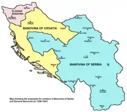 In 1939, faced with killings, corruption scandals, violence and the failure of centralized policy, the Serbian leadership agreed a compromise with Croats. Banovinas would later, in 1939, evolve into the final proposal for the partition of the joint state into three parts or three Banovinas, one Slovene Banovina, one Croatian and one Serbian, with each encompassing most of the ethnic space of each ethnic group. Most of the territory of contemporary Bosnia and Herzegovina was to be part of the Banovina Serbia, since most of the territory of Bosnia and Herzegovina was majority Serb-inhabited, and the Serbs constituted overall relative majority. On 26 August 1939, the president of the Croatian Peasant Party, Vladko Maček and Dragiša Cvetković made an agreement (Cvetković-Maček agreement) according to which a Banovina of Croatia was created which included Sava and the Littoral Banovina, along with a number of districts in southern Dalmatia, the Srem, and north-western Bosnia.[60] Around 20% of the Croatian banovina was inhabited by Serbs,[60] numbering some 800,000.[61] These concessions were unsatisfactory to some Croats, with Serbs also being dissatisfied and seeking a banovina of their own.[62] Bosnian Muslims meanwhile were not consulted on the partition plan and given no alternatives.[57]