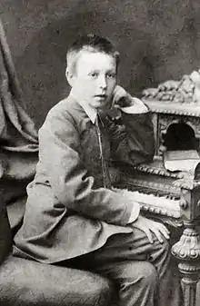 Rachmaninoff's father, who wanted him to be trained by the Page Corps and then join the military, had to sell the five estates one by one to pay his debts due to his financial incompetence and therefore could not afford an expensive military career for him.[12][13] The last estate in Oneg was auctioned off in 1882,[10] and the family moved to a small flat in Saint Petersburg.[14] In 1883, Ornatskaya arranged for Rachmaninoff, now 10, to study music at the Saint Petersburg Conservatory. Later that year, his sister Sofia died of diphtheria, and his father left the family for Moscow.[15] His maternal grandmother stepped in to help raise the children with particular focus on their religious life, regularly taking Rachmaninoff to Russian Orthodox Church services where he first encountered liturgical chants and church bells, two features he would incorporate in his compositions.[16]