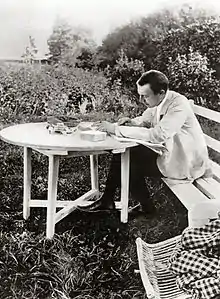 Rachmaninoff fell into a depression that lasted for three years, during which he had writer's block and composed almost nothing. He described this time as "Like the man who had suffered a stroke and for a long time had lost the use of his head and hands".[68] He made a living by giving piano lessons.[69] A stroke of good fortune came from Savva Mamontov, a Russian industrialist and founder of the Moscow Private Russian Opera, who offered Rachmaninoff the post of assistant conductor for the 1897–98 season. The cash-strapped composer accepted, conducting Samson and Delilah by Camille Saint-Saëns as his first opera on 12 October 1897.[70] By the end of February 1899, Rachmaninoff attempted composition and completed two short piano pieces, Morceau de Fantaisie and Fughetta in F major. Two months later, he travelled to London for the first time to perform and conduct, earning positive reviews.[71] In late 1899, however, his depression worsened following an unproductive summer; he composed one song, "Fate", which later became one of his Twelve Songs (Op. 21), and left compositions for a proposed return visit to London unfulfilled.[72] In an attempt to revive his desire to compose, his aunt arranged for the writer Leo Tolstoy, whom Rachmaninoff greatly admired, to have the composer visit his home and receive words of encouragement. The visit was unsuccessful, doing nothing to help him compose with the fluency he had before.[73][74]