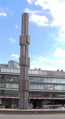 A contest for the central monument in 1962 was won by Edvin Öhrström, with the 37 metre tall glass obelisk which was named Kristall - vertikal accent i glas och stål ("Crystal - vertical accent in glass and steel"). The sculpture, finally completed in 1974 and since haunted by technical problems, never was able to deliver the intended visual output and - quoting Hall - "thus adds itself to the many projects within the [reconstruction of central Stockholm] that didn't endure confrontation with reality." The artist favoured by Helldén, Olle Baertling, started to work on a sculpture for the square in 1960 but never was invited to participate in the contest.[1]