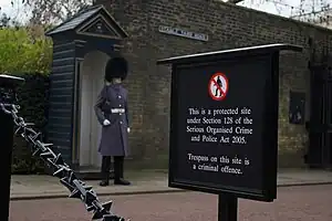 Sections 128-131 criminalise trespass at certain "Protected Sites", which consist of nuclear sites and additional sites designated by the Secretary of State. The latter consist of a range of royal, parliamentary, and government sites. Trespass is punishable on summary conviction with a fine and/or imprisonment for up to a year.[5]