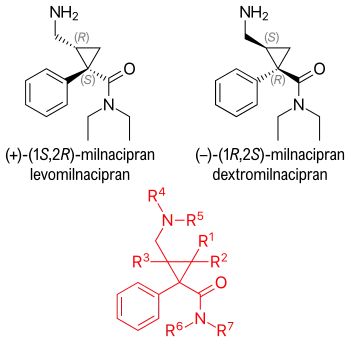 The conformation of milnacipran is an important part of its pharmacophore. Changing its stereochemistry affects the norepinephrine and serotonin concentration. Milnacipran is marketed as a racemic mixture. Effects of milnacipran reside in the (1S,2R)-isomer and substitution of the phenyl group in the (1S,2R)-isomer has negative impact on norepinephrine concentration.[39] Milnacipran has low molecular weight and low lipophilicity. Because of these properties, milnacipran exhibits almost ideal pharmacokinetics in humans such as high bioavailability, low inter-subject variability, limited liver enzyme interaction, moderate tissue distribution and a reasonably long elimination half-life. Milnacipran's lack of drug-drug interactions via cytochrome P450 enzymes is thought to be an attractive feature because many of the central nervous system drugs are highly lipophilic and are mainly eliminated by liver enzymes.[39]