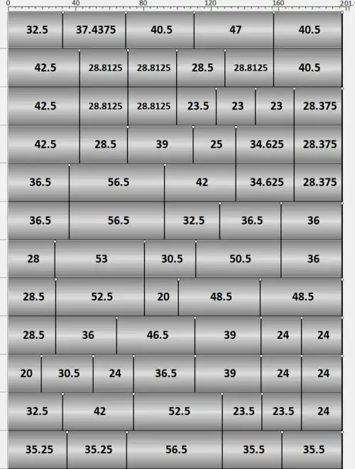 In the above figure, patterns (width no more than 198) are rows; knife changes are indicated by the small white circles; for example, patterns 2-3-4 have a roll of size 42.5 on the left - the corresponding knife does not have to move. Each pattern represents a TSP set, one of whose permutations must be visited. For instance, for the last pattern, which contains two repeated sizes (twice each), there are 5! / (2! × 2!) = 30 permutations. The number of possible solutions to the above instance is 12! × (5!)6 × (6!)4 × (7!)2 / ((2!)9 × (3!)2) ≈ 5.3 × 1035. The above solution contains 39 knife changes, and has been obtained by a heuristic; it is not known whether this is optimal. Transformations into the regular TSP, as described in [2] would involve a TSP with 5,520 nodes.