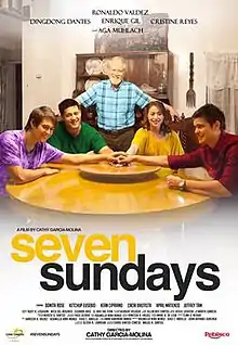 Seven Sundays (stylized as seven sundays) is a 2017 Philippine Family Comedy-drama film directed by Cathy Garcia-Molina. It stars Aga Muhlach, Ronaldo Valdez, Cristine Reyes, Dingdong Dantes and Enrique Gil.[2][3] The film marks Muhlach's return since Of All The Things in 2012.[4] The film was produced and released by Star Cinema on October 11, 2017.[5]