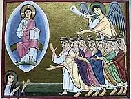 In the Book of Revelation, seven trumpets are sounded, one at a time, to cue apocalyptic events seen by John of Patmos (Revelation 1:9) in his vision (Revelation 1:1). The seven trumpets are sounded by seven angels and the events that follow are described in detail from Revelation Chapters 8 to 11. According to Revelation 8:1–2 the angels sound these trumpets after the breaking of the seventh seal. These seals secured the apocalyptic document held in the right hand of Him who sits on the throne.[1] The trumpets are referred to in Koine Greek as σάλπιγξ (sálpinx, salpinx); this was a straight, narrow bronze tube with a mouthpiece of bone and a bell; they do not resemble modern trumpets. The final three trumpets are sometimes called the "woe trumpets".[2]
