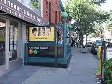 There are eight street stairs – four going up to all four corners of 9th Street and 7th Avenue, and four going up to all four corners of 9th Street and 8th Avenue.[9] An elevator to the mezzanine is on the northwest corner of 7th Avenue and 9th Street.[33] The 8th Avenue entrance also has an intermediate level at the first staircase, otherwise a descending hill.[9]