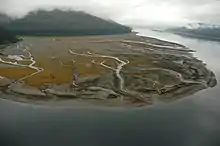 Braided stream and stream delta, showing floral zones in the marine algae at low water. Seymour Canal.