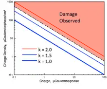 The Shannon criteria relate two parameters for pulsed electrical stimulation: charge density per phase, D (μCoulombs/(phase•cm²)) and charge per phase, Q (μCoulombs/phase) with a dimensionless parameter k:
