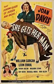 She Gets Her Man is a 1945 American comedy film directed by Erle C. Kenton and written by Warren Wilson, Clyde Bruckman, Ray Singer and Dick Chevillat. The film stars Joan Davis, William Gargan, Leon Errol, Vivian Austin, Milburn Stone and Russell Hicks. The film was released on January 12, 1945, by Universal Pictures.[1][2][3]