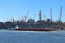 On September 20, 2018, two of the world's largest cranes arrived on site. The largest of the pair is almost 700 feet (210 m) tall and can lift 3,500 tons at a time, and is used around the globe on megaprojects. The smaller of the two is 430 feet (130 m) tall and can lift about 2,300 tons in its current configuration.[16]