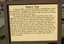 It took station employees some time to realize that the body in the casket was probably the dog's master, and it was showing up for each incoming train to see if his master would be getting off.[1] The dog was later given the name Shep and the station employees took care of him and he lived in and around the station, becoming well known to everyone who passed through.