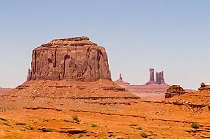 Just northwest of Canyon De Chelly, the Shinarump also forms a caprock in Monument Valley across the border region of northern Arizona – and southern Utah. The Shinarump Conglomerate there is laid upon units of the Moenkopi Formation and remain as resistant caprocks preserving the vertical cliffs of De Chelly Sandstone and other units of the Monument Upwarp/Monument Uplift.[2] The associated Black Mesa (Arizona)-Defiance Uplift extends southeast from Monument Valley into the western border region of New Mexico. The relatively steep east dip of geology units results in increasingly younger geologic units eastwards into New Mexico.