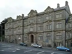 An extra bay to the right, an extra three bays to the left and an extra storey on top of the building were all added in 1913.[1] The Queen's Chambers to the right were also remodelled and given an extra floor at that time and an octagonal shaped council chamber was subsequently built to the rear of the main building.[1] The county council continued to meet at the Shire Hall until the county council was abolished in 1974.[5]