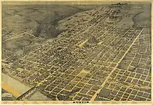 Shoal Creek was named by Edwin Waller, and its mouth roughly marked the western city limits of Austin in the original 1839 Waller Plan of the city.[4][7] In the "Bird's-Eye View" map by Augustus Koch, Shoal Creek is the large canyon on the left side.