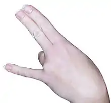 The Shocker is a hand gesture with a sexual connotation.[1] The index, middle, and little fingers are extended, while the ring finger is curled or bent down. The index and middle fingers are held together. The thumb may be tucked against the palm or – in a variation on the gesture – extended.[2]