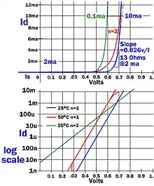 Diode law current–voltage curves at 25 °C, 50 °C, and two ideality factors. The logarithmic scale used for the bottom plot is useful for expressing the equation's exponential relationship.