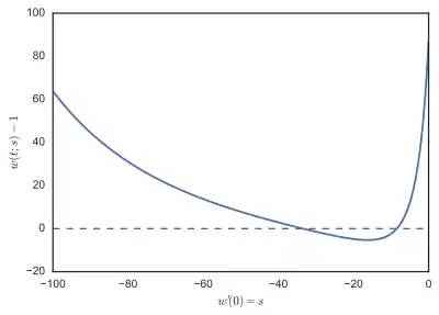 was solved for s = −1, −2, −3, ..., −100, and F(s) = w(1;s) − 1 plotted in the Figure 2. Inspecting the plot of F, we see that there are roots near −8 and −36. Some trajectories of w(t;s) are shown in the Figure 1.