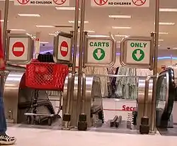 A shopping cart conveyor also known as cartveyor or shopping cart escalator is a device used in multi-level retail stores for moving shopping carts parallel and adjacent to an escalator. Shoppers can load their shopping carts onto the conveyor, step onto the escalator, ride the escalator with the cart beside them and collect the cart with the contained merchandise at the next level.[1]