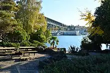 While by then Seattle had several parks adjacent to the water (e.g., Alki Beach Park, Golden Gardens Park, Seward Park), there were (and are) significant gaps. Community groups pushed to increase public shoreline access by improving street ends where public rights of way are platted into the water.[5] As the Seattle Post-Intelligencer put it in 2007, "city maps showed roads drawn right into Lake Washington, Lake Union, Puget Sound, Shilshole Bay, Portage Bay, Elliott Bay and other Seattle waterways."[7] In 1996, the city identified 149 such shoreline street ends and designated them for "public uses and enjoyment." A later ordinance established permit fees to discourage private uses of these lands, and directed the revenue from these fees toward the maintenance and improvement of shoreline street ends.[5] The result has been the creation and maintenance of a wide variety of public spaces: beaches, docks in industrial areas, expansions of existing parks, some providing habitat for native species, others simply providing water views.[8]