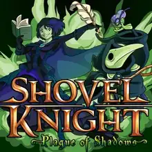 Shovel Knight: Plague of Shadows is a downloadable content (DLC) expansion for the 2014 platform game Shovel Knight, developed and published by Yacht Club Games. The player takes control of Plague Knight, an alchemist on a journey to create the ultimate potion. Plague Knight attacks by throwing alchemical bombs, and has the ability to double jump and perform a more powerful "burst jump" that sends him forward through the air. Gameplay is similar to the original Shovel Knight but features a new story and alterations to the levels to account for Plague Knight's new movement.