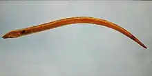 Shrimp eels can be distinguished from other eels by their lack of a caudal fin and external jugostegalia (basket-like structure of over-lapping free rays). It can also be distinguished from other snake eels by its lack of markings, well-developed pectoral fin, and dorsal fin originating behind the gill slit.[3]
