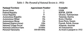 National-territorial units were expanded into smaller and smaller units called national soviets. The structure resembled a pyramid, with the number of units growing until reaching the bottom layer, the individual, with a fixed national identity. Tens of thousands of national borders were drawn and re-drawn, forcing everyone to choose a national identity and a set territory corresponding to that identity. This caused a large amount of ethnic conflict. Minorities wanted national soviets, yet even after this division, often remained the minority in a national soviet belonging to another group. The majority of such a soviet did not look kindly on its minority and often actively tried to expel them, by any means possible.[4]