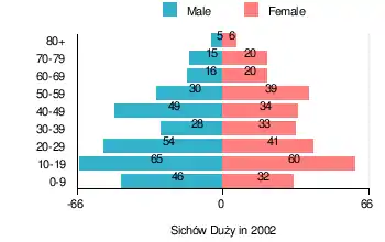 According to the 2002 Poland census, there were 594 people residing in Sichów Duży village, of whom 51.9% were male and 48.1% were female. In the village, the population was spread out, with 28.5% under the age of 18, 38.7% from 18 to 44, 20% from 45 to 64, and 12.6% who were 65 years of age or older.[1]