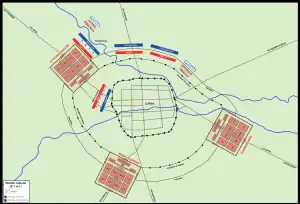 The consular armies returned to Capua and renewed their blockade. Supplies were massed at Casilinum and stongholds were established along the Volturnus River.[5] Great care was taken to secure safe and effective supply lines. The two consular armies were reinforced by a third army under a praetor Claudius Nero.[5] They started to build a ditch and a wall to encirle and blockade the city and another ditch and wall facing outward to defend their siegeworks.[5] In 211, the siege of Capua remained the main priority of the Senate and both consuls and Nero had their commands extended as pro-magistrates.[5] While Hannibal was busy in the south of Italia, the Romans were employing innovative use of light-armed troops (velites) to ward off forays by the Capuan cavalry.[6][7]