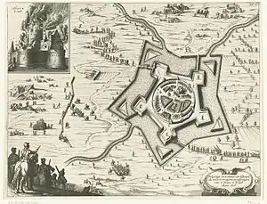 On July 23 the Dutch and English besieged the town and had a good view of the surrounding environment; as a result, Casimir did not find it necessary to construct a circumvallation line against a possible Spanish relief attempt. Casimir with skilled pioneers dug siege lines with trenches, and batteries were put into position. A few companies of English were detached against Broeckhuise castle on the outskirts which posed a threat but it was captured within two days.[1] It was subsequently plundered and burnt by Dutch troops.[6]