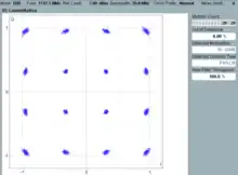A constellation diagram is a representation of a signal modulated by a digital modulation scheme such as quadrature amplitude modulation or phase-shift keying.[1] It displays the signal as a two-dimensional xy-plane scatter diagram in the complex plane at symbol sampling instants. In a manner similar to that of a phasor diagram, the angle of a point, measured counterclockwise from the horizontal axis, represents the phase shift of the carrier wave from a reference phase; the distance of a point from the origin represents a measure of the amplitude or power of the signal.