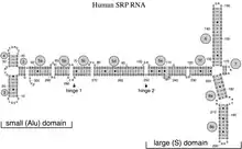 In eukaryotes and archaea, eight helical elements fold into the Alu and S domains, separated by a long linker region.[6][7] The Alu domain is thought to mediate the peptide chain elongation retardation function of the SRP.[6] The universally conserved helix which interacts with the SRP54 M domain mediates signal sequence recognition.[7][8] The SRP19-helix 6 complex is thought to be involved in SRP assembly and stabilises helix 8 for SRP54. binding[6] Humans have three functional SRP RNA genes, conveniently named RN7SL1, RN7SL2, and RN7SL3. The human genome in particular is known to contain a large amount of SRP RNA related sequence, including Alu repeats.[5]
