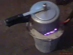 A traditional Sigri is made from a steel cylinder by cutting a small hole in the side wall (to be used when lighting the stove). Then, several thin iron rods are pushed through the walls about seven centimetres below the upper opening, to form a mesh. The walls and the interior are covered with approximately an inch of clay, which acts as an insulator.