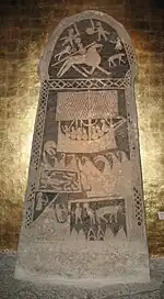 The Hunninge picture stone was found on Gotland and includes imagery that may be related to the Völsung cycle. The top section shows a man on a horse with a dog meeting a woman and two men fighting near a dead man who is holding a ring.[3] This could represent Sigurd and Brynhild, Sigurd and Gunnar fighting, and Sigurd's death.[3] Alternatively, the man carrying a ring could be the messenger Knéfrøðr, carrying Gudrun's warning message of a ring with a wolf's hair wrapped around it. The scene on the bottom left depicts a woman watching the snake pit where Gunnar is lying, and at the bottom three men who could be Gunnar and Högni attacking Atli.[3]