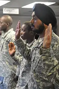 In January 2017, following the outcome of a lawsuit under the Religious Freedom Restoration Act, regulations were changed, allowing for the wearing of beards and turbans by religious individuals (the same ruling also allowed the wearing of burkas and hijabs by Muslims). The ruling does stipulate that the regulations can require that the beards must be worn at certain lengths (via rolling and clipping) and must not interfere with operations.[23] Second Lieutenant Kanwar Singh became the first Sikh service-member to complete US Army's Officer Candidate School under the new military policy. He completed Basic Combat Training (Fort Jackson - 2016), Officer Candidate School (Massachusetts, Connecticut and Alabama - 2018) and Signal Basic Officer Leaders Course (Fort Gordon - 2020) with unshorn hair, beard, and turban. He currently serves as a commissioned officer in the Massachusetts National Guard (US Army Signal Corps).[24]