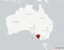 Silky mice are native to Australia, specifically south-eastern Australia (western Victoria).[3] They live in sandy heathlands near plants such as banksias, tea-trees, broombush and mallee eucalypts, which they use to shelter the entrance to their burrows. These mice will dig complex burrows about 2 cm in diameter with multiple tunnels and chambers.[2][3][1] In order to support their heavily herbivorous diet, they need a high plant diversity in their habitat consisting of plants which will bloom and bear fruit throughout the entire year. Silky mice are negatively affected by intensely high temperatures and water shortages.[2]