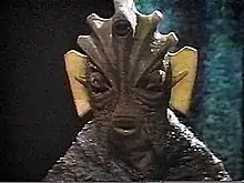 - ↑ In episode 3 of Doctor Who and the Silurians, the Third Doctor (Jon Pertwee) discovers notes containing calculations of the age of the Earth inside the office of Dr Quinn (Fulton Mackay), a human scientist who desires the Silurians' scientific knowledge in the serial. The Doctor says that the calculations have "particular reference to the Silurian era".[1] In the following episode, the Doctor addresses one of the creatures on screen for the first time as a "Silurian".[2] In The Sea Devils, the Third Doctor claims that "Silurian" is a "complete misnomer", mentioning "The chap who discovered them must have got the period wrong."[3] In "The Hungry Earth" (2010), the Eleventh Doctor (Matt Smith) appears to describe "Silurian" as a former name, when he says that Homo reptilia were "once known as the Silurian race",[4] although the name "Silurian" is subsequently used again on screen by various characters in "Cold Blood" (2010),[5] "A Good Man Goes to War" (2011)[6] and "Dinosaurs on a Spaceship" (2012).[7] By the time of Warriors of the Deep, set in 2084, the Silurians have begun to refer to themselves by the term "Silurian".[8]