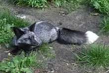 The silver fox, sometimes referred to as the black fox,[1] or blue fox,[2] is a melanistic form of the red fox (Vulpes vulpes). Silver foxes display a great deal of pelt variation. Some are completely glossy black except for a white colouration on the tip of the tail, giving them a somewhat silvery appearance. Some silver foxes are bluish-grey, and some may have a cinereous colour on the sides.