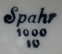 Friedrich Wilhelm Spahr mostly used marks impressed directly into the silver. The very earliest and rarest of Spahr's marks began with "MSG 1000 10" ("MSG" standing for "Manufaktur Schwäbisch Gmünd"). This mark was followed by "Spahr 1000 10" (sometimes stamped in black letters on a porcelain base), later with "Spahr 1000", and finally with transparent plastic labels on the bottom printed "Spahr Feinsilberauflage 1000 / 1000".