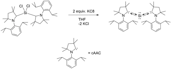 The first cAAC stabilized silylone was first reported by Mondal et al. in 2013 (where cAAC is ligand used was :C(CH2)(CMe2)2N-2,6-iPr2C6H3).[1] The complex was synthesized by reduction of (cAAC)2SiCl2, a stable biradical precursor species, with two equivalents of potassium graphite (KC8) reducing agent in tetrahydrofuran (THF) solution.[3] Under this preparation, 95% yield of product was achieved and formed a dark blue solution in hexane with rod-shaped crystals.[3] The crystallized product was found to be stable under inert atmosphere and unreactive towards hydrogen gas, carbon dioxide, and ammonia.[4] Furthermore, they were found to melt at 195 °C and decompose at 220 °C.[4]