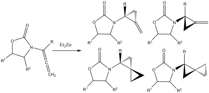 A Furukawa-modified Simmons–Smith reaction cyclopropanates both double bonds in an allenamide to form amido-spiro [2.2] cyclopentanes, featuring two cyclopropyl rings which share one carbon. The product of monocyclopropanation is also formed.[36][37]