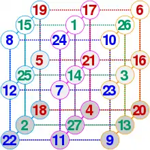 The simple magic cube requires only the basic features a cube requires to be magic. Namely, all lines parallel to the faces, and all 4 space diagonals sum correctly.[1] i.e. all "1-agonals" and all "3-agonals" sum to